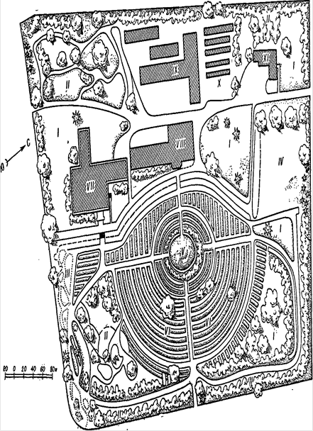 Рис. Ботанический сад лекарственных растений Московского фармацевтического института. Проект планировки сада. Генеральный план. Общая площадь 5.0 га. 1—23 — группы лекарственных растений, применяемых в советской формакопее (сердечного действия, кровоостанавливающие, желчегонные, слабительные, раздражающие, вяжущие, рвотные, возбуждающие, ароматические, витаминные и т.д.). — центральная площадка парковой части сада; //— альпийская горка для горных растений; ///— руд для водных н влаголюбивых растений; IV — систематический участок; V — питомник.