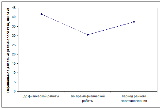 Результаты исследования показали, что до физической работы уровень лактата в капиллярной крови спортсменов соответствует физиологической норме. Нарушений со стороны кислотно-основного состояния не выявлено. Следует отметить имеющуюся гиповентиляцию легких, что выражается в высоких значениях парциального давления углекислого газа. На фоне этого, вероятно, происходит нарастание буферных резервов крови, так как отмечается избыток ВЕ и гидрокарбонатных ионов. Возможно, на дорабочем уровне у спортсменов отмечается респираторный ацидоз, компенсированный метаболическим алкалозом. Такое исходное состояние должно позволить лучше переносить предстоящее закисление организма при выполнении физической работы.