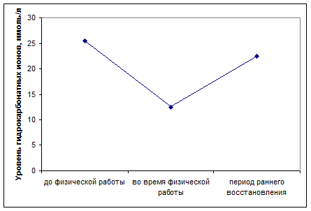 До физической работы в капиллярной крови спортсменов выявлено незначительное повышение содержания гидрокарбонатных ионов по сравнению с физиологической нормой, что также указывает на высокий уровень развития щелочных резервов организма.