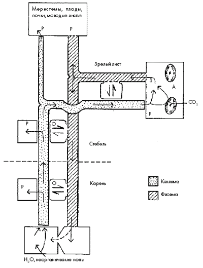 Рис. 3. Схема циркуляции воды, неорганических ионов и ассимилятов в растении. Вода и неорганические ионы, поглощенные корнем, передвигаются по ксилеме вверх с транспирационным током. Большая их часть транспортируется к листьям. В листьях значительное количество воды и неорганических ионов перемещается во флоэму и выносится из них вместе с сахарозой в токе ассимилятов. Буквой А обозначены места, специализированные на поглощении и ассимиляции исходных материалов из внешней среды. Буквы З и Р указывают соответственно места загрузки и разгрузки, О – точки, в которых происходит обмен между ксилемой и флоэмой