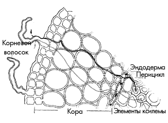 Таким образом, вода поглощается корневыми волосками за счет разницы водного потенциала почвенного раствора и цитоплазмы клеток, образующих корневые волоски. Затем вода проходит через кору корня в ксилему и поднимается по ней к листьям.