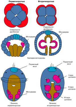 Помимо судьбы рта, первичноротые и вторичноротые отличаются другими эмбриологическими особенностями. Во-первых, это характер дробления оплодотворенного яйца: у первичноротых оно спиральное, а у вторичноротых - радиальное (рис. 1). Другое отличие состоит в способе закладке целома (вторичной полости тела): у первичноротых стенки вторичной полости тела происходят от двух клеток, а у вторичноротых за счет выпячивания карманов эмбрионального кишечника (рис. 1). Третьим важнейшим различием между первично- и вторичноротыми является судьба зачатка первичного мозга: у первичноротых он дает начало мозгу взрослых форм, а у вторичноротых всегда редуцируется, так что новый нервный центр возникает в другом месте заново. Вторичноротые - это вторичномозговые животные.