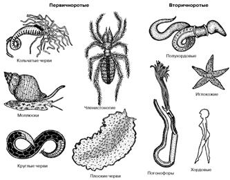 Рис. 2. Представители основных групп первичноротых и вторичноротых животных.