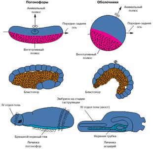 Хотя хордовые - это вторичноротые животные, все же их развитие имеет ряд особенностей. На рис. 3 представлены соответствующие стадии развития одной из групп вторичноротых - погонофор и низших хордовых - асцидий.