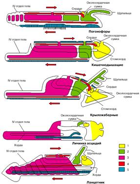 Рис. 4. Сравнение планов строения различных групп вторичноротых (личинка асцидий и ланцетник изображены в перевернутом положении). 1 - целомы первой пары, 2 - целомы второй пары, 3 - целомы третьей пары, 4 - кровеносная система, 5 - нервная система. Стрелки показывают направление тока крови.