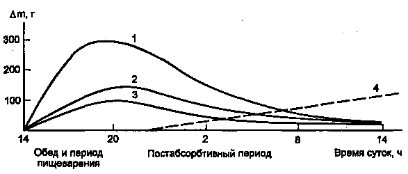 Рисунок 1. Изменение количества энергоносителей в организме человека (в тканях, не в желудке и кишечнике) в течение суток после однократного приема пищи. (1 — гликоген; 2 — жиры; 3 — аминокислоты/белки; 4 — изменение скорости глюконеогенеза, г/сут.)