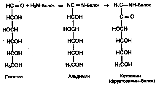 Поздние осложнения сахарного диабета связаны прежде всего с повреждением кровеносных сосудов (диабетические ангиопатии). Основной механизм повреждения тканей — гликирование (гликозилирование) белков — не ферментативная реакция глюкозы со свободными аминогруппами белковой молекулы (Лиз, Арг, N-концевая аминокислота):