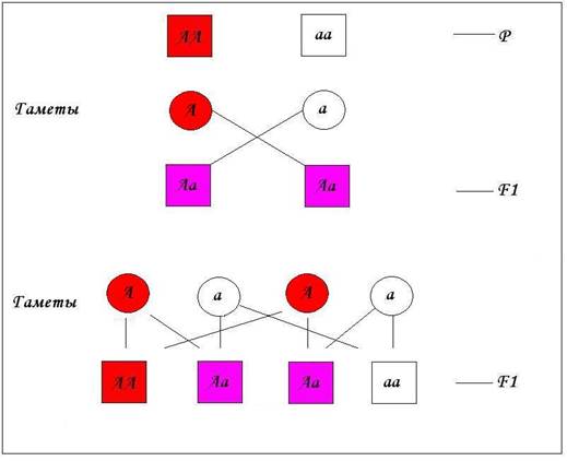По данной аллельнои паре образуются два сорта гамет. При оплодотворении гаметы, несущие одинаковые или разные аллели, случайно встречаются друг с другом. В силу статистической вероятности при достаточно большом количестве гамет в потомстве 25 % генотипов будут гомозиготными доминантными, 50 % — гетерозиготными, 25 % — гомозиготными рецессивными, т. е. устанавливается отношение 1АА:2Аа:1 аа.
