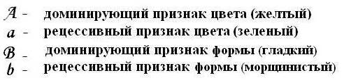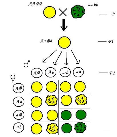 Для дигибридного скрещивания Мендель взял гомозиготные растения гороха, отличающиеся по двум показателям — окраски семян (желтые, зеленые) и формы семян (гладкие, морщинистые). Доминантные признаки — желтая окраска (А) и гладкая форма (В) семян. Каждое растение образует один сорт гамет по изучаемым аллелям: При слиянии гамет все потомство будет единообразным: