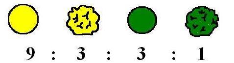Легко подсчитать, что по фенотипу потомство делится на 4 группы: 9 желтых гладких, 3 желтых морщинистых, 3 зеленых гладких, 1 желтая морщинистая (9:3:3:1). Если учитывать результаты расщепления по каждой паре признаков в отдельности, то получится, что отношение числа желтых семян к числу зеленых и отношение гладких семян к морщинистым для каждой пары равно 3:1. Это можно выразить алгебраически как квадрат двучлена