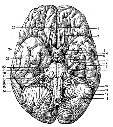 Рисунок 1 Основание головного мозга и выход корешков черепных нервов. |