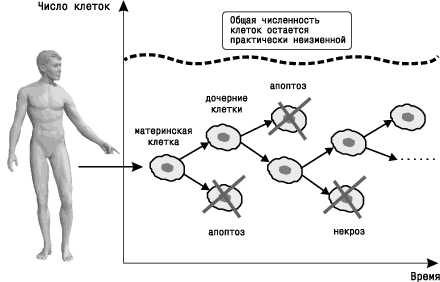 Это происходит за счет уравновешивания процессов возникновения новых клеток (митоза) и гибели клеток, естественной (апоптоза) или случайной (некроза). При смещении равновесия, например, гибели большого количества клеток в результате травмы или другого негативного воздействия, включаются механизмы регенерации (увеличение интенсивности деления клеток для замещения погибших), о которых уже было сказано. Таким образом, общая численность клеток поддерживается практически на постоянном уровне.