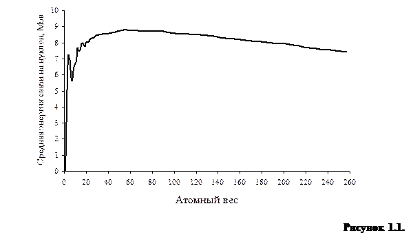 В сороковые годы ХХ века благодаря работам Астона, Демпстера и других ученых с большой точностью были определены значения дефекта массы и вычислены энергии связи для ряда изотопов. На рис.1.1 эти результаты представлены в виде графика, на котором по оси абсцисс отложен атомный вес изотопов, а по оси ординат – средняя энергия связи частицы в ядре.