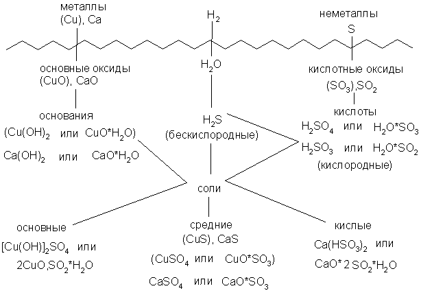 В левой части схемы под металлами помещены их типичные соединения — основные оксиды и основания, в правой части схемы помещены соединения, типичные для неметаллов, кислотные оксиды и кислоты. Водород, помещенный в верхней части схемы, дает очень специфический, идеально амфотерный оксид — воду Н2О, которая в комбинации с основным оксидом дает основание, а с кислотным — кислоту. Водород в сочетании с неметаллами образует бескислородные кислоты. В нижней части схемы помещены соли, которые, с одной стороны, отвечают соединению металла с неметаллом, а с другой — комбинации основного оксида с кислотным.