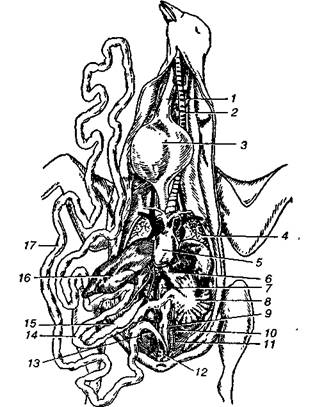 1 — стравохід; 2 — трахея; 3 — воло; 4 — легеня; 5 — серце; в — залозистий шлунок; 7 — сім'яник; 8 — м'язовий шлунок; 9 — сім'япровід; 10 — нирка; 11 — сечовід; 12 — клоака; 13 — сліпі вирости; 14 — дванадцятипала кишка; 15 — підшлункова залоза; 16 — печінка; 17 — тонка кишка