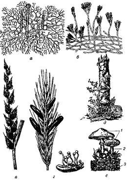 а — мукор; б — пеніцил (а, б — збільшено); в — сажка; г — ріжки (праворуч — пророслий склероцій); д — трутовик;