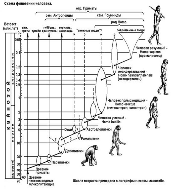 Филогенетическая линия гоминид, с которой связано происхождение современного человека (Homo sapiens) отделилась от других человекообразных обезьян 6—7 млн лет назад. К настоящему времени все роды и виды гоминид, исключая Homo sapiens, вымерли. Сравнение последовательностей ДНК показывает, что самыми близкими родственниками человека из ныне живущих видов являются два вида шимпанзе (обыкновенный и бонобо). Появление человека было связано с рядом существенных анатомических и физиологических модификаций, в том числе: