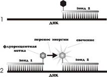 Данный способ детекции накопления продуктов амплификации отличается повышенной специфичностью, так как увеличение флуоресценции происходит при комплементарном связывании с ампликонами сразу 2-х ДНК зондов [11] (Рис 3). Принцип метода заключается в переносе энергии от одного флуорофора, находящегося на 3` конце первого зонда, ко второму флуорофору, находящемуся на 5` конце второго зонда, причем расстояние между флуорофорами составляет 1-3 нуклеотида.