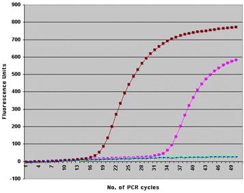 В некоторых случаях флуоресценция от "сломанных" проб наблюдается и на более поздних стадиях PCR, к 20-25 циклу. Такой эффект нежелателен, поскольку он создает трудности при выборе базовой линии, что может привести к "маскировке" начала экспоненциальной фазы. В таком случае рекомендуется собирать реакцию заранее и инкубировать ее в холодильнике 1 час или более до добавления ДНК (если реакции инкубируются в темноте и при температуре около +4o C, максимальное время инкубации практически неограничено) [20].