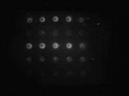По результатам эксперимента (рис. 20) видно что в 1 и 3 ряду амплификация прошла, так как интенсивность флуоресценции заметно возросла. Темное пятнышко по центру лунок – это некоторый объем воздуха который образуется при покрытии плашки пленкой. Это указывает на то, что практически весь объем лунки заполнен образцом.