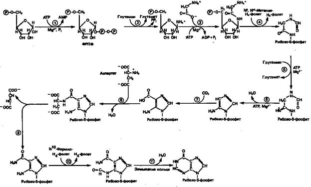 Информация о происхождении каждого из атомов в молекуле пуринового основания получена в процессе радиоизотопных исследований, проведенных на птицах, крысах и человеке (рис. 1). На рис. 2 представлена схема пути биосинтеза пуриновых нуклеотидов. Первая стадия {реакция 1) — образование 5-фосфорибозил-1-пирофосфата (ФРПФ). Эта реакция не уникальна для биосинтеза пуриновых нуклеотидов. ФРПФ служит также предшественником в синтезе пиримидиновых нуклеотидов (см. рис. 10), он необходим для синтеза NAD и NADP—двух коферментов, в состав которых входит никотиновая кислота. В реакции 2 (рис. 2), катализируемой фосфорибозил-пирофосфат-амидотрансферазой, из ФРПФ и глутамина образуются глутамат и 5-фосфорибозиламин. Хотя возможны и другие механизмы синтеза 5-фосфорибозиламина, реакция, катализируемая амидотрансферазой, имеет наиболее важное физиологическое значение в тканях млекопитающих.