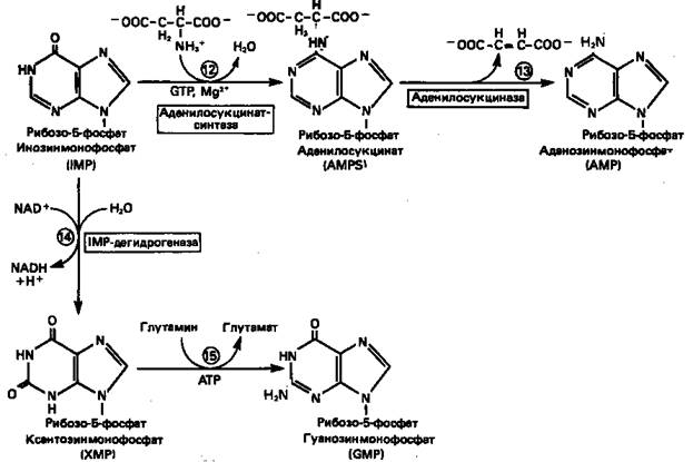 Как показано на рис. 3 адениновые (реакции 12 и 13) и гуаниновые нуклеотиды (реакции 14 и 15) образуются путем аминирования и соответственно окисления и аминирования общего предшественника—инозинмонофосфата (IMP). Аминирование IMPпротекает через стадию образования промежуточного соединения, в котором аспартат присоединяется к инозиновой кислоте, образуя аденилосукцинат. Эта реакция напоминает реакцию 8 биосинтеза пуринов (рис. 2), в которой а-азот аспарагиновой кислоты поставляет атом N-1 пуринового кольца. Образование аденилосукцината катализируется аденилосукцинатсинтазой и происходит при участии GTP. Удаление остающейся части аспарагиновой кислоты в виде фумарата приводит к образованию адениловой кислоты (аденозинмонофосфат; AMP). Отщепление фумарата от аденилосукцината катализируется ферментом аденилосукциназой. Этот же фермент катализирует отщепление фумарата от аминоимидазолсукцинилкарбоксамидрибозил-фосфата (реакция 9).