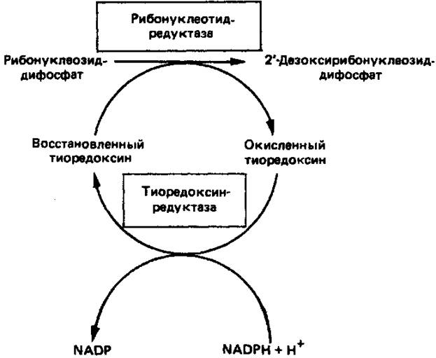 Синтез пуриновых и пиримидиновых дезоксирибонуклеотидов происходит путем прямого восстановления 2'-углерода рибозного остатка соответствующего рибонуклеотида, а не путем синтеза denovo из 2'-дезоксианалога ФРПФ. Восстановление 2'-углеродного атома рибозы происходит только после превращения пуриновых и пиримидиновых нуклео-тидов в соответствующие нуклеозиддифосфаты. У некоторых бактерий в этом восстановительном процессе участвует кобаламин (витамин В12 ). У животных процесс восстановления идет и в отсутствие витамина В12 . Восстановление рибонуклеозиддифосфатов в дезоксирибонуклеозид-дифосфаты катализируется рибонуклеотидредуктазойи требует участия тиоредоксина(белковый кофактор), тиоредоксинредуктазы (флавопротеиновый фермент) и NADPH (кофактор). Непосредственным донором электронов для нуклеотида является тиоредоксин, который предварительно восстанавливается NADPH. Обратимое окислительно-восстановительное превращение тиоредоксина катализируется тиоредоксинредуктазой. Восстановление рибонуклеозиддифосфата восстановленным тиоредоксином катализируется рибонуклеозидредуктазой (рис. 5). Эта сложная ферментная система функционирует в клетках только в период активного синтеза ДНК и деления.
