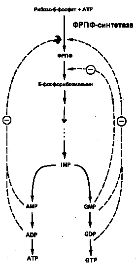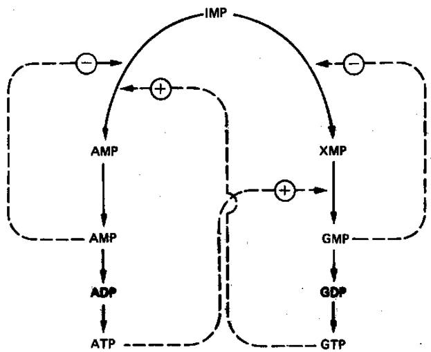 AMP регулирует активность аденилосукцинатсинтетазы, влияя по принципу обратной связи на собственный синтез. GMP регулирует собственный синтез, действуя по тому же принципу на 1МР-дегидрогеназу. Наряду с этим образование аденилосукцината из IMP на пути к AMP стимулируется GTP. Образование же GMP из ксантозинмонофосфата требует присутствия АТР. Таким образом, наблюдается существенная перекрестная регуляция дивергентных путей метаболизма IMP. Такая регуляция тормозит биосинтез одного из пуриновых нуклеотидов при недостатке другого. Гипоксантингуанин-фосфорибозилтрансфераза, катализирующая образо-вание из ксантина и гуанина IMP и GMP соответственно, весьма чувствительна к ингибирующему действию этих нуклеотидов.