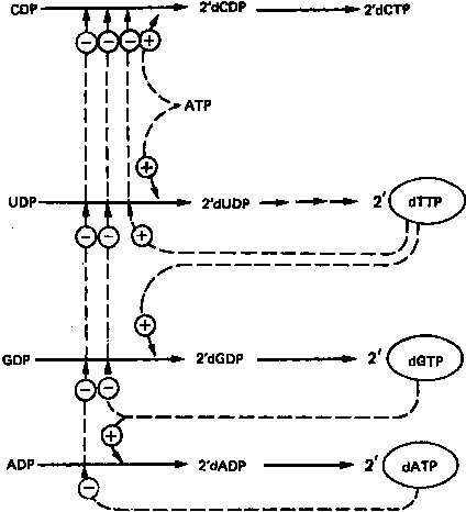 Рисунок 8. Регуляция восстановления пуриновых и пири мидиновых рибонуклеотидов до соответствующих 2'- дезоксирибонуклеотидов. Сплошные линии указывают путь химических превращений. Пунктирные линии обозна чают положительную и отрицательную регуляцию по принципу обратной связи.