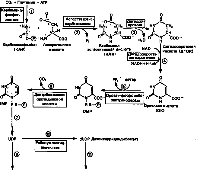 Первый истинный пиримидиновый рибонуклеотид—уридилат (уридинмонофосфат, UMP) образуется при декарбоксилировании оротидилата (реакция 6). Таким образом, только на предпоследней стадии образования UMP происходит фосфорибозилирование гетероцикла.