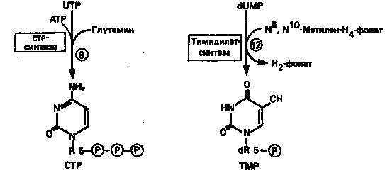 Образование тимидилата (тимидинмонофосфат; ТМР) (реакция 12) — единственная реакция на пути биосинтеза пиримидиновых нуклеотидов, требующая участия производного тетрагидрофолата в качестве донора одноуглеродного фрагмента. 2'-Дезокси-UMP метилируется тимидилатсинтазой, использующей N5 , N10 -метилентетрагидрофолат как донор метильной группы.