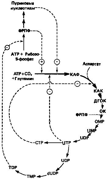 Путь биосинтеза пиримидиновых нуклеотидов регулируется двумя различными механизмами. Активность первых двух ферментов находится под контролем аллостерических эффекторов. Кроме того, три первых и два последних фермента являются объектами координированной репрессии—дерепрессии. Карбамоилфосфатсинтаза ингибируется UTP, пуриновыми нуклеотидами, но активируется ФРПФ (рис. 10). Аспартаттранскарбамоилаза особенно чувствительна к ингибирующему влиянию СТР. Аллостерические свойства аспартаткарбамоилазы микроорганизмов явились предметом интенсивных и ставших уже классическими исследований механизмов аллостерической регуляции активности ферментов.