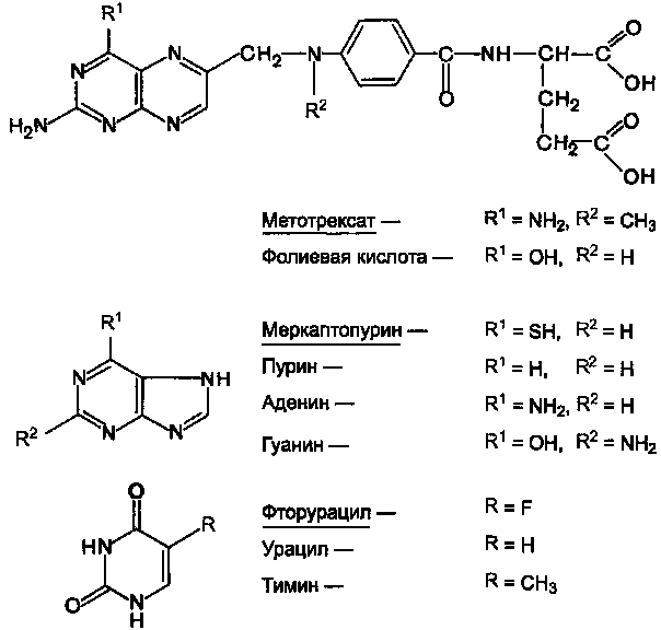 Препараты этой группы являются антагонистами естественных метаболитов. При наличии опухолевых заболеваний используют в основном следующие вещества (см. структуры).