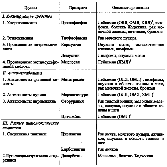 Таблица 1. Основные показания к применению ряда синтетических цитотоксических средств. 1 ОЛЛ — острая лимфобластическая лейкемия; ОМЛ — острая миелогенная лейкемия; ХЛЛ — хроническая лимфоцитарная лейкемия; ХМЛ — хроническая миелогенная лейкемия.