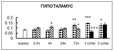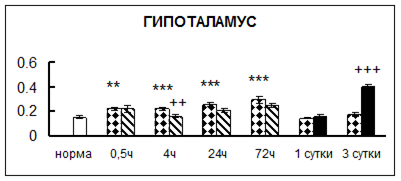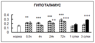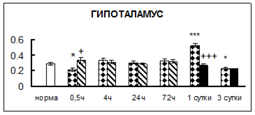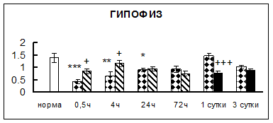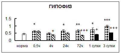 Внутривенная и интрацеребровентрикулярная инъекции ODN произвели дозозависимое ингибирование экспрессии гена ПОМК в промежуточном гипофизе крыс. Подобные результаты были получены и в нейронах гипоталамуса [108, 153]. Интрацеребровентрикулярная инъекция ODN в дозах 1 и 0,1 мкг/кг вызвала увеличение уровня мРНК ПОМК в гипоталамусе на 33,5 и 27,4%, соответственно [108]. Givalois и др. в подобных условиях получили уменьшение уровня мРНК ПОМК на 17 и 7% в передней и промежуточной долях гипофиза крыс соответственно [156]. Приведенные данные показывают, что активация ГАМКА -рецептора эндогенным бензодиазепиновым лигандом может ингибировать экспрессию гена ПОМК в гипофизе и гипоталамусе [151, 156]. Удаление надпочечников привело к изменению эффекта, вызванного ODN: произошло увеличение уровня мРНК ПОМК в промежуточном и переднем гипофизе на 60 и 10% соответственно, по сравнению с контролем. Удаление семенников вызвало уменьшение содержания мРНК ПОМК в передней доле и увеличение в промежуточной доле гипофиза, но не изменило отрицательного влияния ODN, наблюдаемого в контрольных животных. Таким образом, in vivo уменьшение уровня мРНК ПОМК в гипофизе, вызванное эндогенными бензодиазепинами, модулируется гормонами надпочечников и половых желез [156].