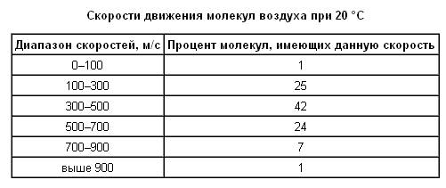 В расчетах скоростей движения молекул воздуха при 20°С были получены данные, представленные в табл.