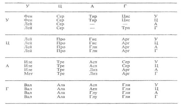 Все синтезируемые в процессе трансляции белки построены из остатков 20 аминокислот (так называемых кодируемых). Какой именно кодон ответствен за включение той или иной аминокислоты, можно определить по таблице, в которой буквы А, Г, У, Ц обозначают основания, входящие в нуклеотиды (соответственно аденин, гуанин, урацил и цитозин): в вертикальном ряду слева - в первый нуклеотид кодона, в горизонтальном ряду сверху - во второй, в вертикальном ряду справа - в третий. Трехбуквенные сочетания, например фен, сер, лей, - сокращенные названия аминокислот. Прочерки в таблице означают, что три кодона - УАА, УАГ и УГА в нормальных условиях не кодируют какие-либо аминокислоты. Такие кодоны называют "бессмысленными", или нонсенс-кодонами. Они являются "сигналами" остановки синтеза полипептидной цепи.