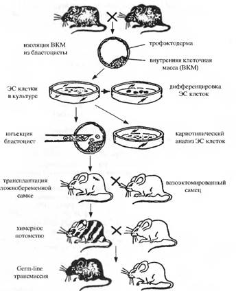 На рис. представлена общепринятая в настоящее время схема получения ЭС клеток и их использование для получения химерных животных. В последние годы ЭС клетки используются в различных направлениях исследований.
