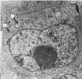 Ультраструктура ЭС клетки. Х5800. Видно крупное ядро клетки, а также эндоплазматический ретикулум и митохондрии
