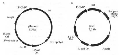 Схема плазмиды pTat. 3,1 кб Sall/PstI-фрагмент изолята НХВ-2 HIV-1, в котором делетировав ген nef, содержит 1-й транслируемый экзон гена tat, интрон и 2-й транслируемый экзон гена tat. Ген находится под управлением промотора цитомегаловируса в векторе pcDNA3. Плазмида несет также ген устойчивости к неомицину; схема плазмиды pNef. Плазмида содержит ген nefизолята HXD-3 HIV-1 под цитомегаловирусным промотором в векторе pBC12/CMv