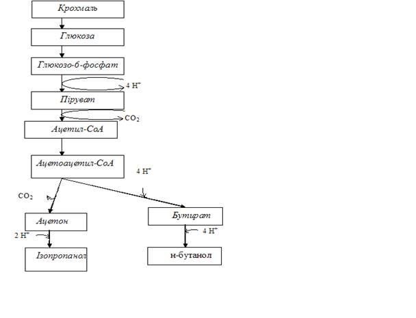 Рис.1. Схема реакцій ацетон-бутанольного бродіння