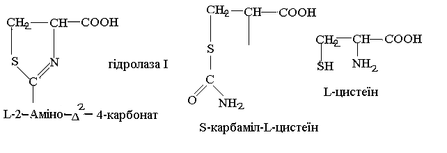 1. Гідролітичні ферменти (гідролази). Наприклад 2-аміно-тіазолін-4-карбоксигідролаза яка відповідає за синтез L-цистеїну (рис2.), або L-α-аміно-ε-капролактам-ліаза, яка відповідає за синтез L-лізину. Для використання неочищених ферментів, цілі клітини обробляють поверхнево-активними речовинами, що викликають зміни проникності і можуть використовувати мутантні штами, в яких продукт не використовується в обміні речовин.