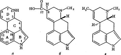 а— эрголін; б — лізергінова кислота; в — агроклавін