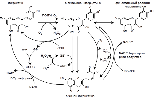 Флавоноиды легко и необратимо окисляются до п-гидрохиноновой формы, которая далее обратимо может окисляться до п-хинона. Последний легко полимеризуется в не растворимое соединение. Окисление флавоноидов катализируется ионами тяжелых металлов и под действием света. Промежуточные формы окисления флавноидов могут являться токсичными для клеток, а в процессе их взаимопревращения в ряде случаев образуются АФК (рис. 4).