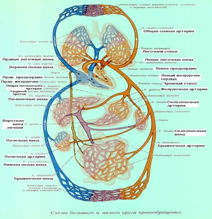 В левом желудочке начинается большой круг кровообращения. При сокращении левого желудочка кровь выбрасывается в аорту - самую большую артерию. От дуги аорты отходят артерии, снабжающие кровью голову, руки и туловище. В грудной полости от нисходящей части аорты отходят сосуды к органам грудной клетки, а в брюшной - к органам пищеварения, почкам, мышцам нижней половины тела и другим органам. Артерии снабжают кровью все органы и ткани человека. Они многократно ветвятся, сужаются и постепенно переходят в кровеносные капилляры. Через капилляры большого круга кровь (в которой оксигемоглобин эритроцитов распадается на гемоглобин и кислород) отдает питательные вещества и кислород тканям. Кислород поглощается тканями и используется для биологического окисления, а выделяющийся углекислый газ уносится плазмой крови и гемоглобином эритроцитов. Кровь собирается в вены большого круга. Вены верхней половины тела впадают в верхнюю полую вену, вены нижней половины тела - в нижнюю полую вену. Обе вены несут кровь в правое предсердие сердца. Здесь завершается большой круг кровообращения. Венозная кровь переходит в правый желудочек, откуда начинается малый круг. Кровообращение в сердце