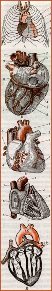 1 - аорта с отходящими сосудами; 2 - верхняя полая вена; 3 - легочные вены; 4 - нижняя полая вена; 5 - вены сердца; 6 - артерия сердца; 7 - левый желудочек; 8 - левое предсердие; 9 - легочная артерия; В - сердце с отходящими сосудами (вид спереди): 1 - аорта; 2 - легочная артерия; 3 - правый желудочек; 4 - правое предсердие; 5 - легочные вены; 6 - верхняя полая вена; Г - внутреннее строение сердца (правая сторона): 1 - аорта; 2 - легочная артерия с полулунным клапаном; 3 - правый желудочек; 4 - створчатые клапаны с сухожильными нитями и сосочковыми мышцами; 5 - нижняя полая вена; 6 - правое предсердие; 7 - верхняя полая вена;
