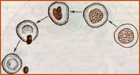 артериальная кровь выглядит ярко-алой. Гемоглобин, оставшийся без кислорода, темно-красный. Поэтому венозная кровь значительно темнее артериальной. У всех позвоночных, кроме млекопитающих, клетка эритроцита имеет ядро. У млекопитающих зрелые эритроциты ядер не имеют: они теряются в процессе развития (иллюстрация). Двояковогнутая форма эритроцита и отсутствие ядра способствует переносу газов, так как увеличенная поверхность клетки быстрее поглощает кислород, а отсутствие ядра позволяет использовать для транспортировки кислорода и углекислого газа весь объем клетки. У мужчин в 1 мм3 крови содержится в среднем 4,5-5 млн эритроцитов, у женщин - 4-4,5 млн. Иллюстрация: