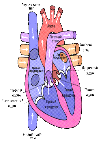 Циркуляция крови через сердце. Малый круг кровообращения проходит через правое предсердие, правый желудочек, лёгочную артерию, сосуды лёгких, лёгочные вены. Большой круг проходит через левые предсердие и желудочек, аорту, сосуды органов, верхнюю и нижнюю полые вены. Направление движения крови регулируется клапанами сердца.
