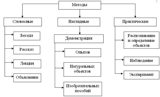 Таким образом, на основании преобладающего характера источников знаний, деятельности учителя и учащихся методы преподавания биологии разделяют на три группы или рода: словесные, наглядные, практические.