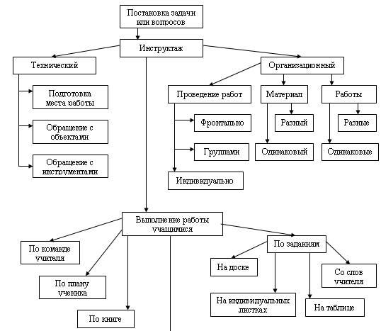 Любой из методов осуществляется в практике преподавания приемами. Методические приемы — элементы того или иного метода, выражающие отдельные действия учителя и учащихся в процессе преподавания. Они могут носить логический, организационный и технический характер. На рис. 2 изображена структура проведения практических работ на уроке различными методическими приемами.